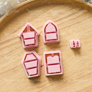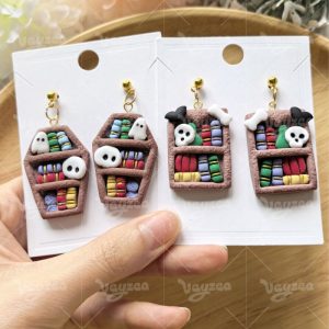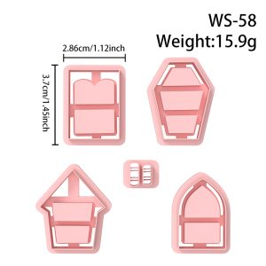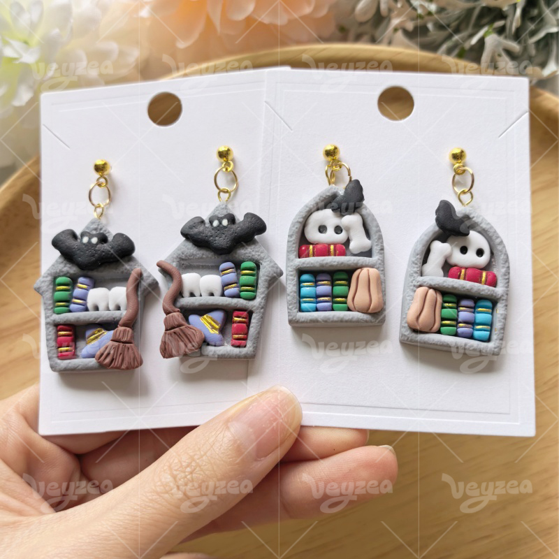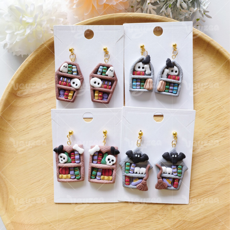 【 Bookshelf Cutters Set 】5 polymer clay earring cutters: Halloween Bookshelf Polymer Clay Earring Mold Clay Cutters,Ghost Fairy Earrings Clay Mold Clay Cutters,It Includes A Variety Of Basic Shapes Such As Coffin Bookshelf And Steeple Cabin Bookshelf, Which Can Be Freely Matched With Mini Books, Skeletons, Bats, Brooms And Other Halloween Decorations Inside.