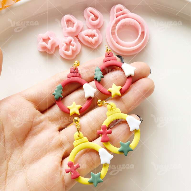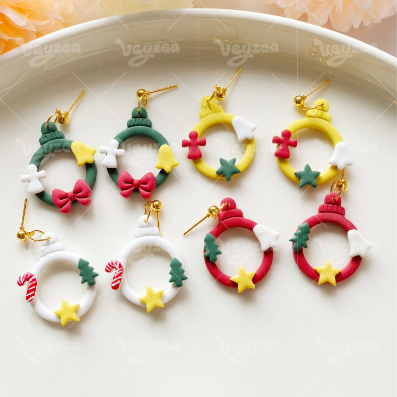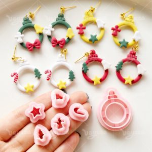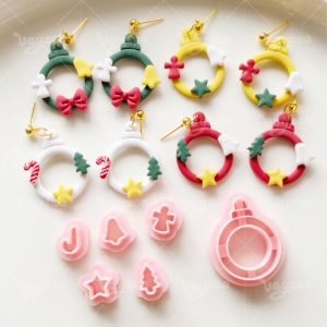 【 Christmas Wreath Series Cutters Set 】6 polymer clay earring cutters:Christmas Wreath Polymer Clay Earring Mold Clay Cutters,Contains A Ring-Shaped Garland Main Body, Which Can Be Matched With Various Christmas Accessories Such As Candy Canes, Christmas Trees, Stars, Gingerbread Men, Bells, Etc. It Has Rich Layers And Is Full Of Design And Festive Atmosphere.