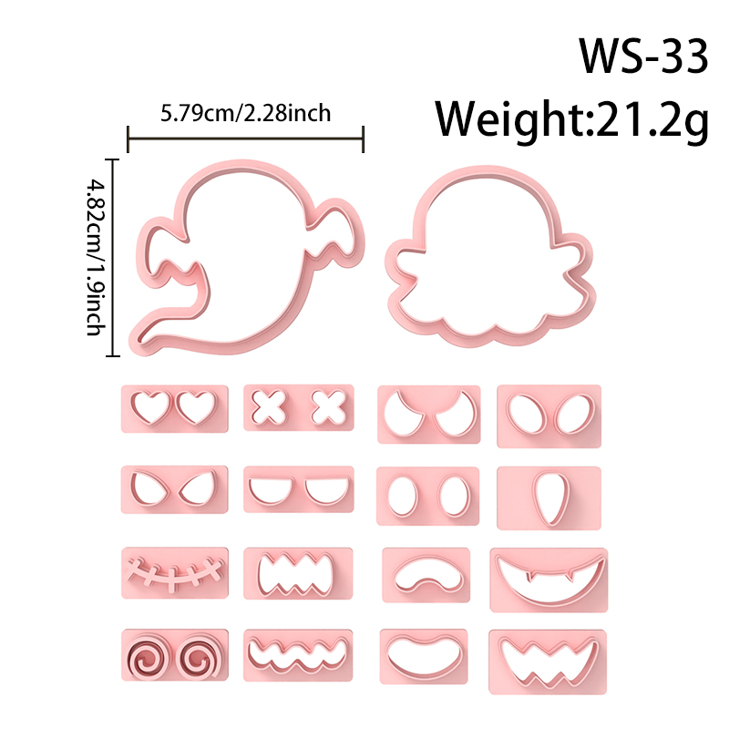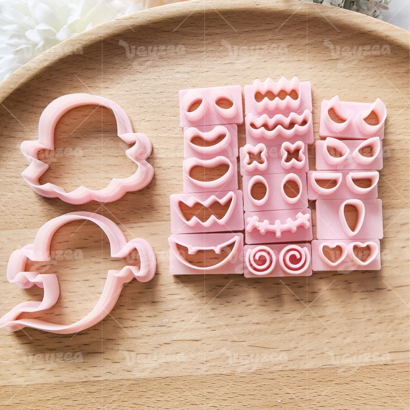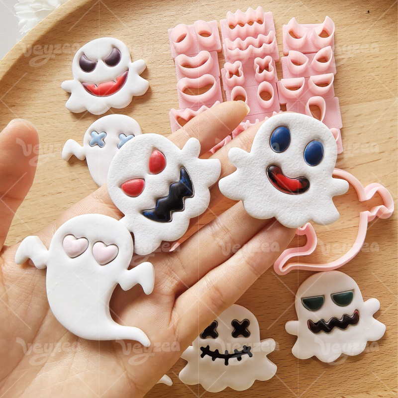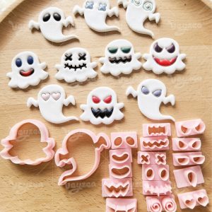 【 Ghost Cutters Set 】18 polymer clay earring cutters:Halloween Clay Cutters Set Clay Cutters,Mix And Match Ghost Polymer Clay Earring Molds Clay Cutters,Contains 2 Ghost Bodies And Multiple Sets Of Expression Clay Cutters, Allowing You To Freely Combine Dozens Of Ghosts With Different Expressions, From Cute To Funny, To Suit Different Halloween Styles.