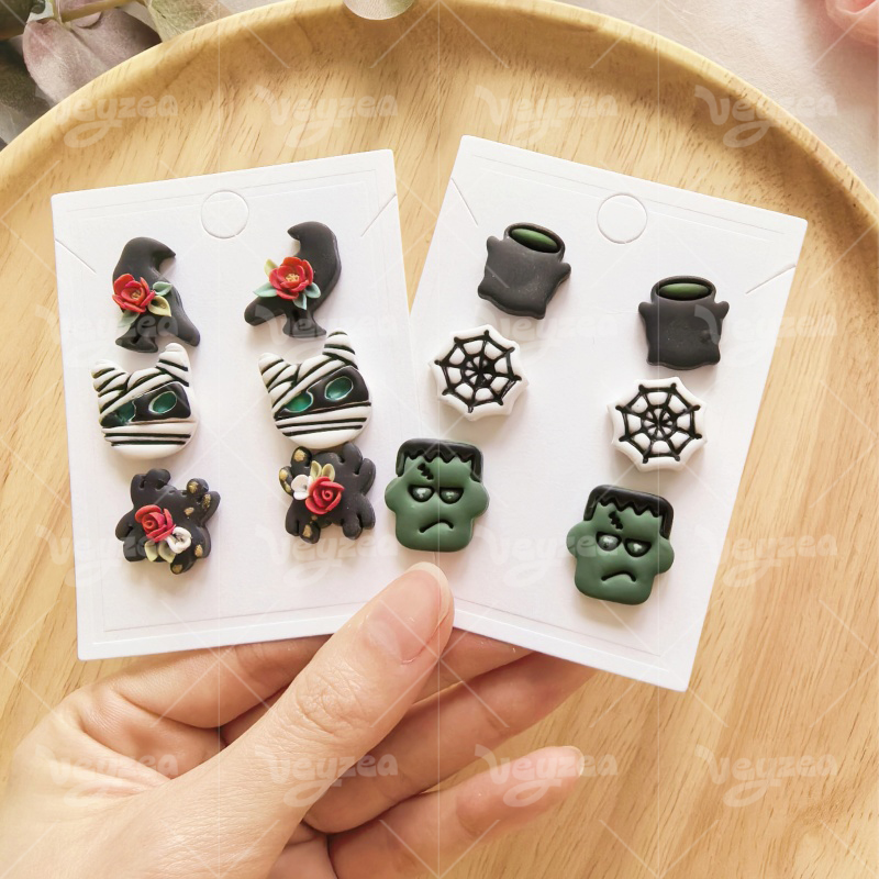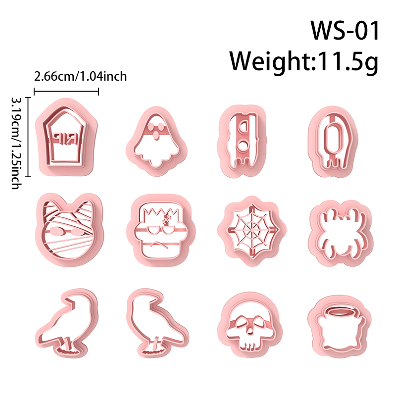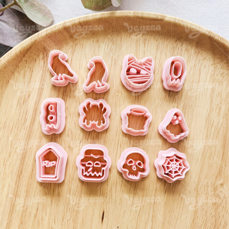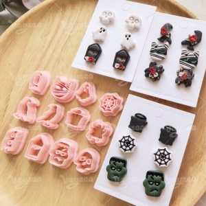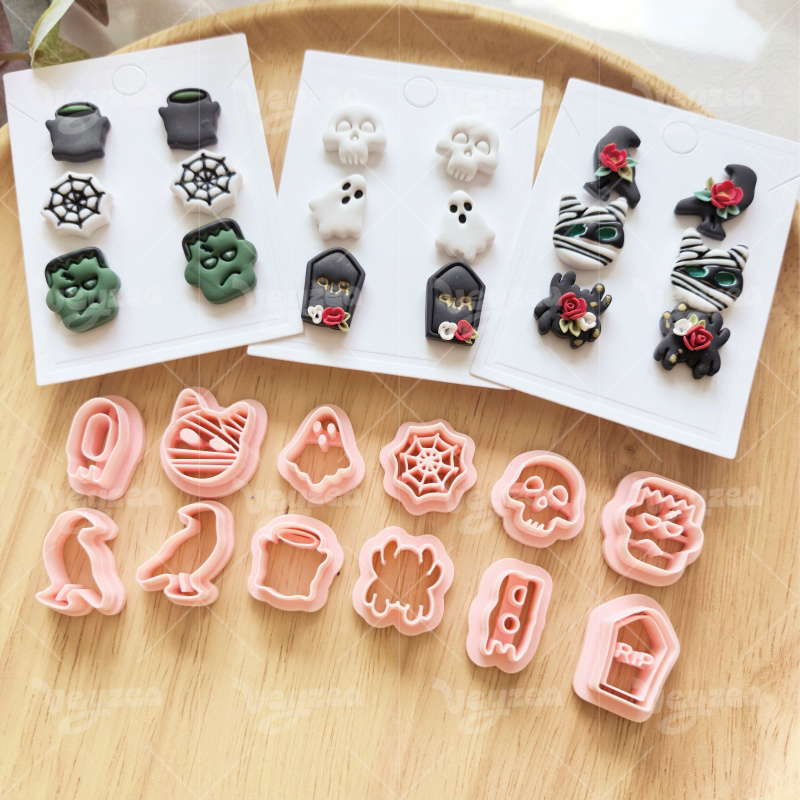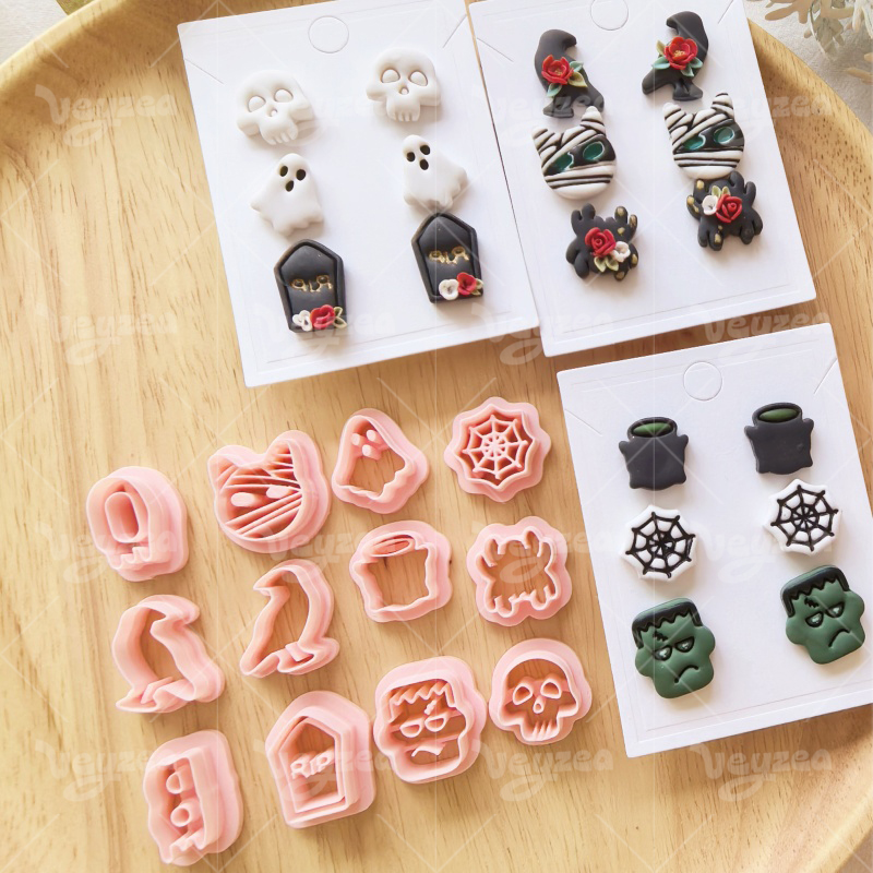【 Halloween Themed Series Cutters Set 】12 polymer clay earring cutters:Halloween Themed Polymer Clay Earring Mold Clay Cutters,Ghost Cute Earrings Clay Mold Clay Cutters,Contains Spider Webs, Ghosts, Skeletons, Tombstones, Mummified Cats, Crows, And More.