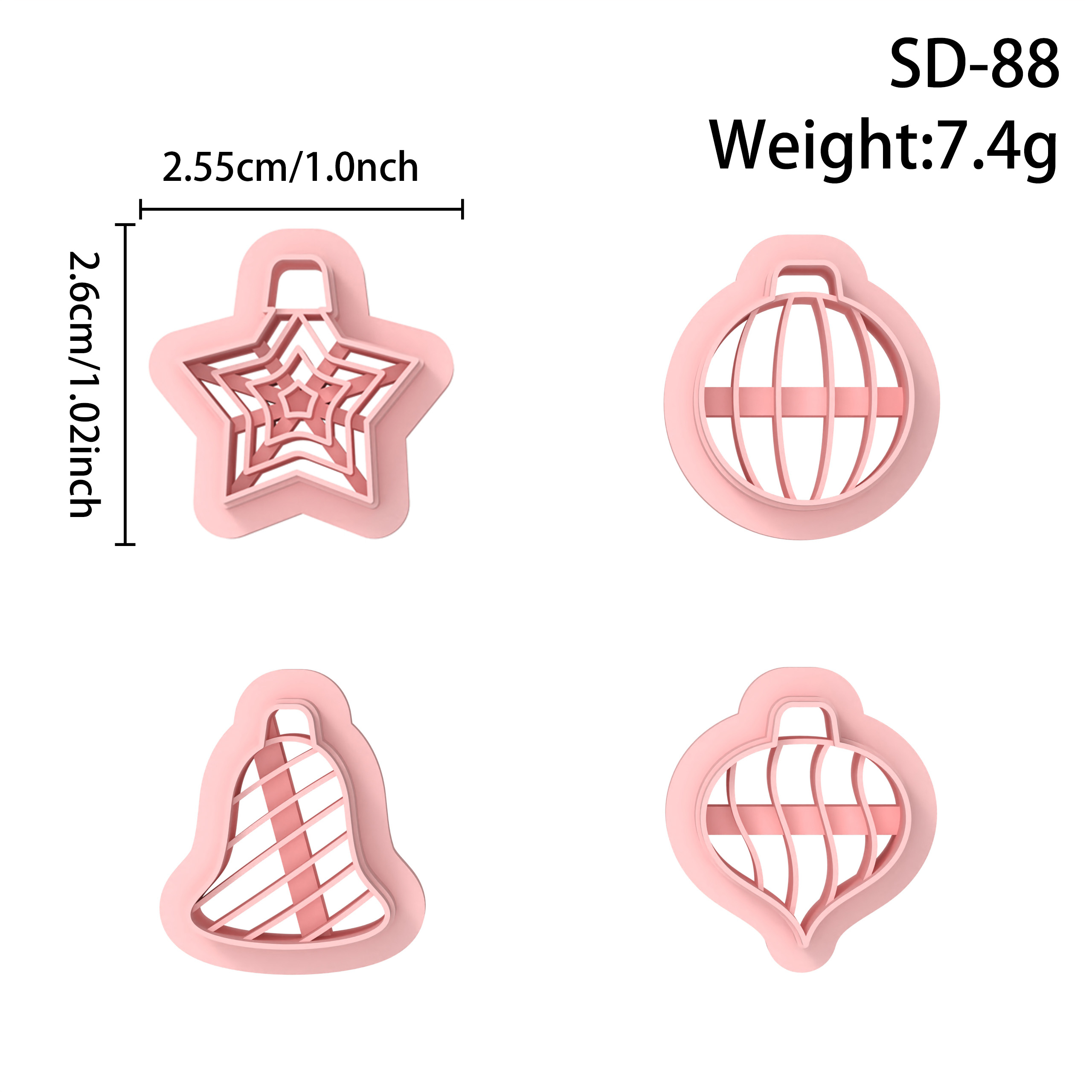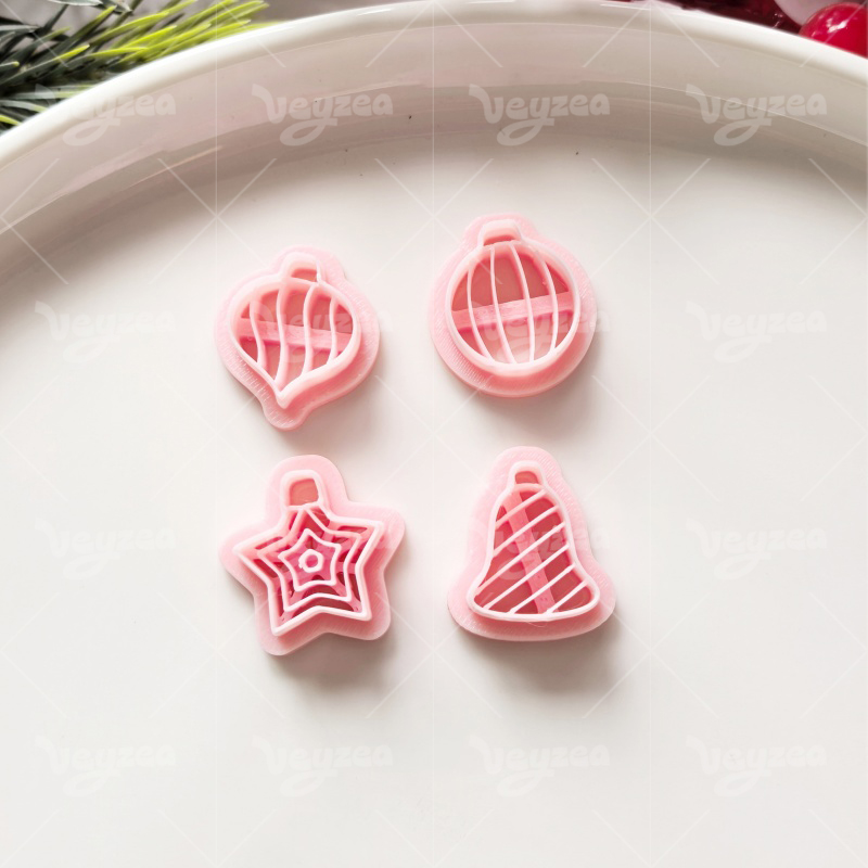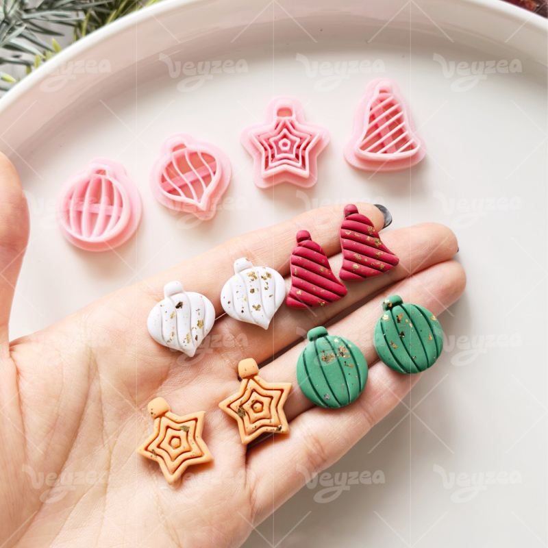 【 Simple Christmas Ornament Series Cutters Set 】4 polymer clay earring cutters:Simple Christmas Ornament Polymer Clay Earring Mold Clay Cutters,Various Styles Of Simple Christmas Earrings Clay Molds Clay Cutters,Contains Five-Pointed Stars, Striped Balls, Water Drop Balls, Striped Bells, Etc Clay Cutters.