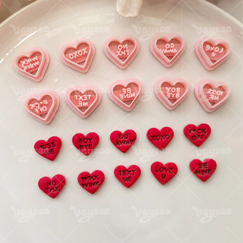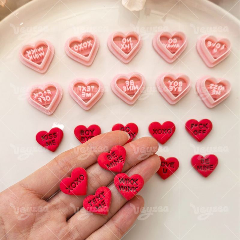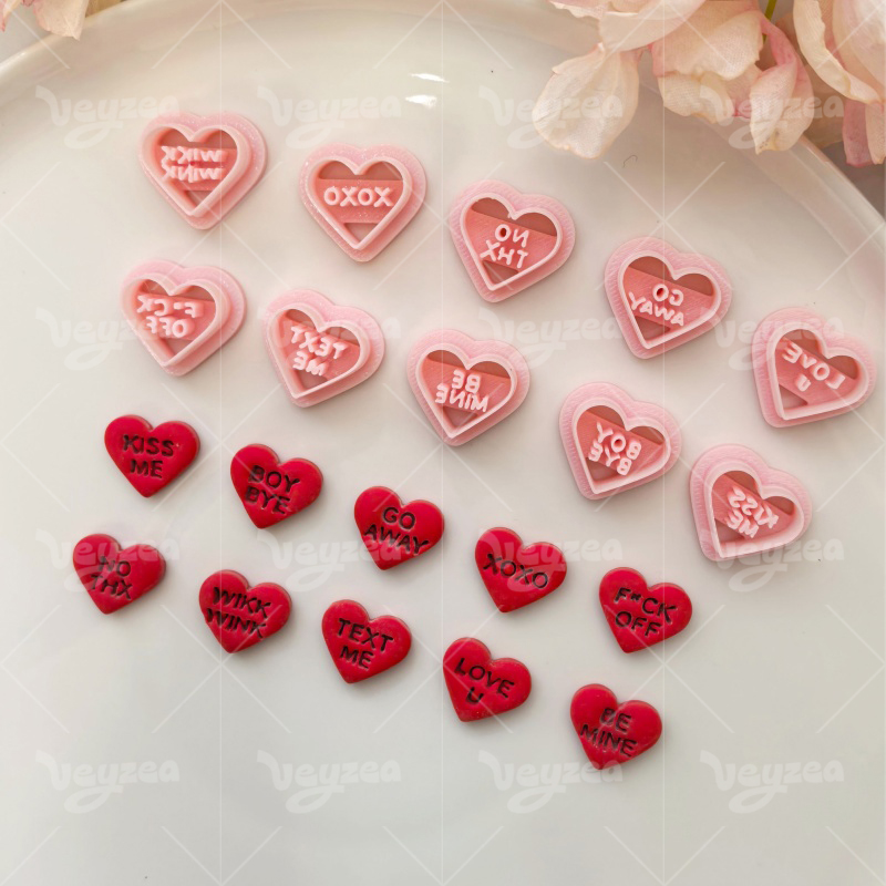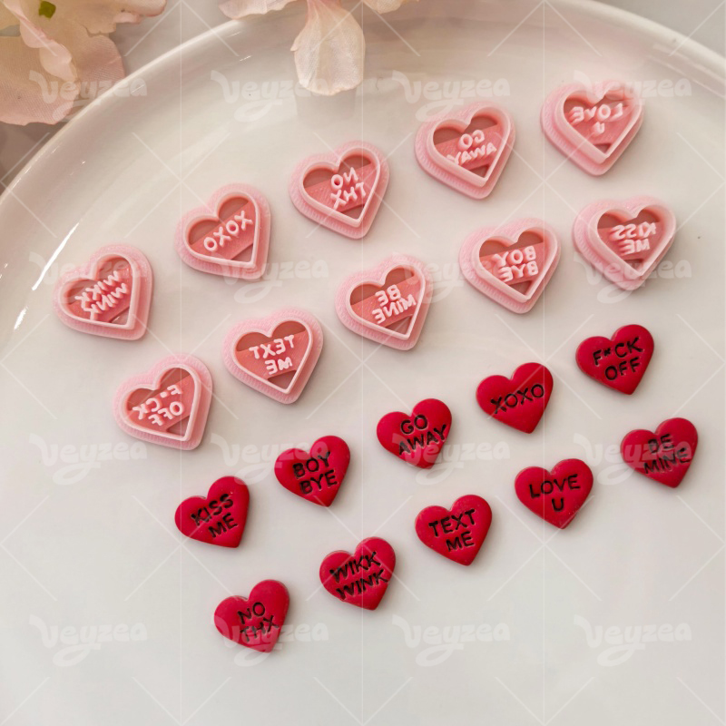 【Valentine’s Day Heart Shape Text Cutters Set 】10 polymer clay earring cutters:Valentine’s Day Heart Shape Text Polymer Clay Earring Mold Clay Cutters,Various styles of heart-shaped earrings clay cutter set Clay Cutters,Contains sweet and cool words such as “KISS ME”, “BOY BYE”, “GO AWAY”, “XOXO”, “LOVE U” and “BE MINE”.